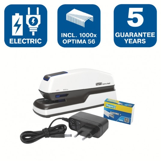 Zszywacz elektryczny Rapid Optima GripE, do 20 kartek, na baterię lub zasilacz, biały