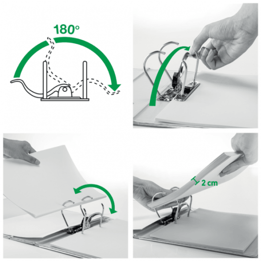 Dzięki zastosowaniu wytrzymałych materiałów oraz wysokiej klasy mechanizmu 180° zapewnia doskonałe walory użytkowe i funkcjonalne. Format A4, szerokość grzbietu 80 mm.