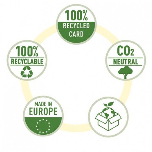 - Neutralny dla klimatu, karton w 100% pochodzący z odzysku i w 100% nadający się do recyklingu, z certyfikatami środowiskowymi Blue Angel i FSC.