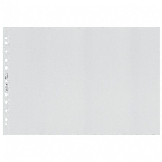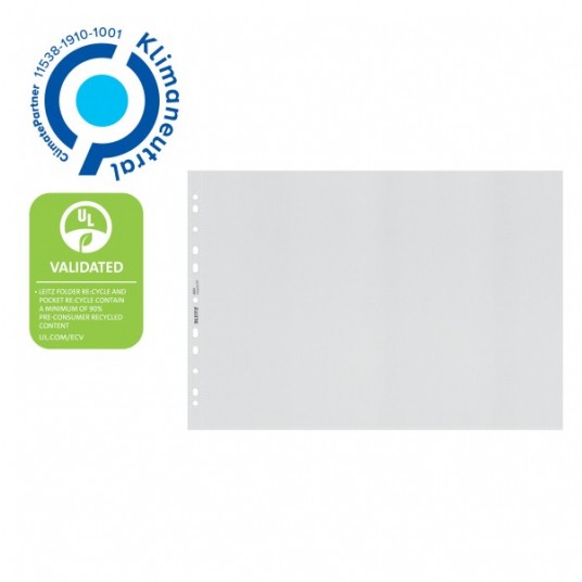 Uniwersalny, perforowany, wzmocniony pasek z 11 otworami do każdego segregatora; koszulka jest wykonana z przezroczystej folii pochodzącej z recyklingu.