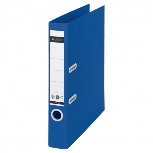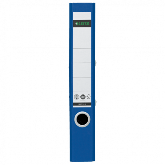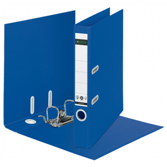 Otwór na palec z jasnoszarego plastiku z recykligu ułatwia wyjmowanie segregatora z półki, a pierścienie rado zabezpieczają segregator, gdy jest zamknięty i ustawiony w pozycji pionowej.