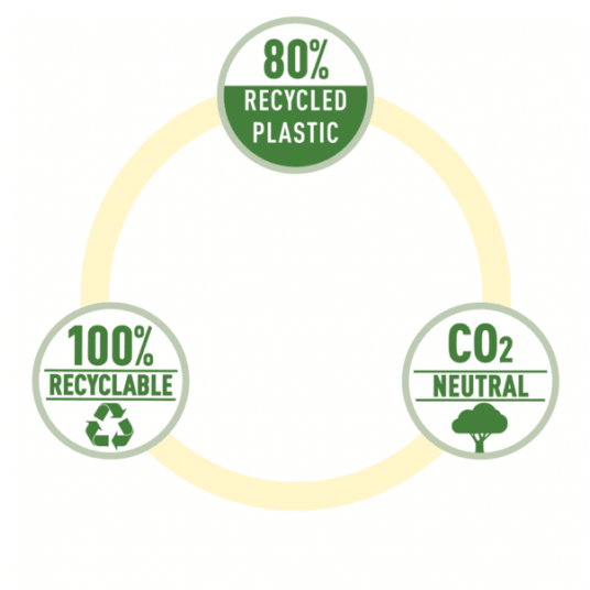 - Wykonana z plastiku w 80% pochodzącego z recyklingu (pokonsumpcyjnego), neutralna dla klimatu i w 100% nadająca się do ponownego przetworzenia.