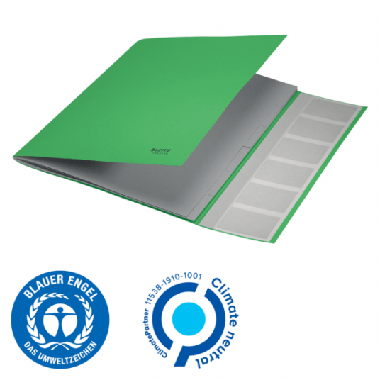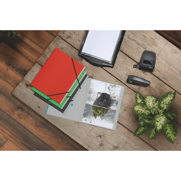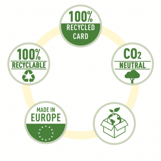 Wykonana z kartonu w 100% pochodzącego z recyklingu (pokonsumpcyjnego), neutralna dla klimatu i w 100% nadająca się do ponownego przetworzenia (po zdjęciu gumki).