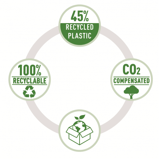 - Wykonany z plastiku w 45% pochodzącego z recyklingu pokonsumenckiego, neutralny dla klimatu dzięki redukcji emisji CO2 i systemowi kompensacji.