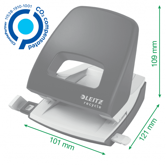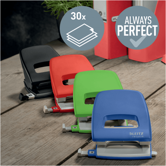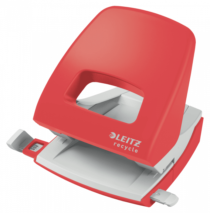 - Efektowny, wysokiej jakości dziurkacz wykonany z plastiku pochodzącego z recyklingu przeznaczony do codziennego użytku.