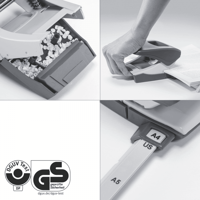 - Wyraźne oznaczenia formatu i wytrzymała prowadnica zapewniają perfekcyjne wyrównanie papieru.