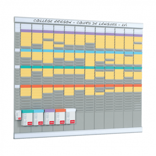 Planer zawiera: 12 kolumn z 32 okienkami na karty T-Card w rozmiarze 1,5, 1 kolumnę na indeksy od 1 do 31 bez okienek, 2 aluminiowe szyny z paskami tytułowymi, 20 opakowań zawierających po 100 kolorowych kart T-Card w rozmiarze 1,5.