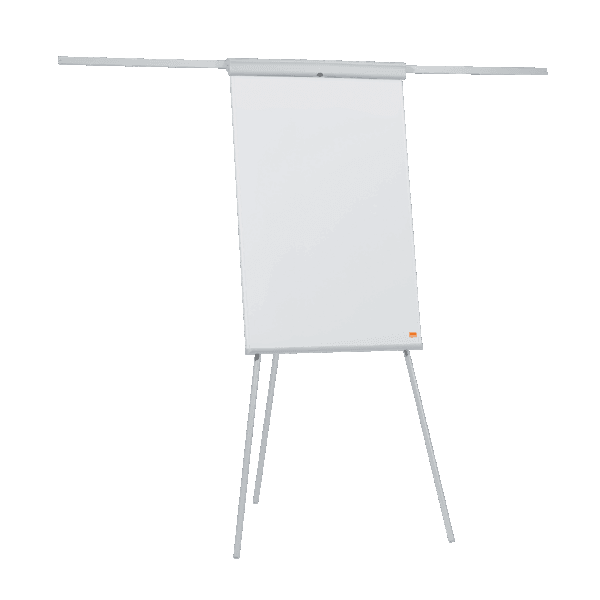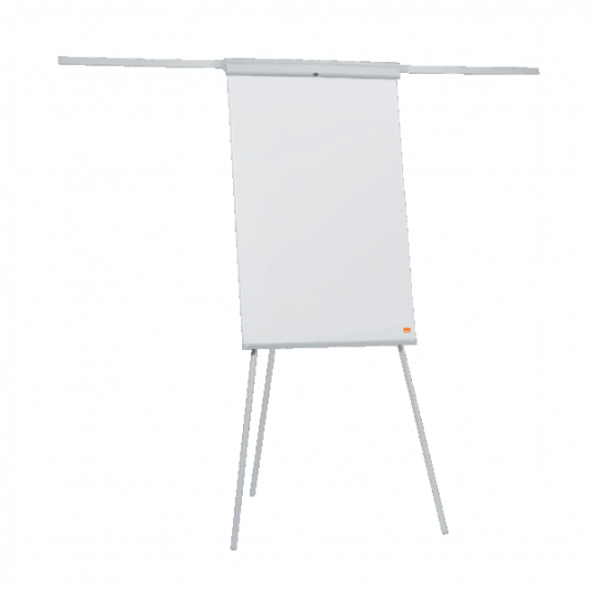 Flipchart ze stalową magnetyczną tablicą suchościeralną umieszczony na trójnożnym statywie, ze zintegrowaną półką na markery i dwoma wysuwanymi ramionami, przydatnymi, gdy trzeba pokazać dodatkowe strony.